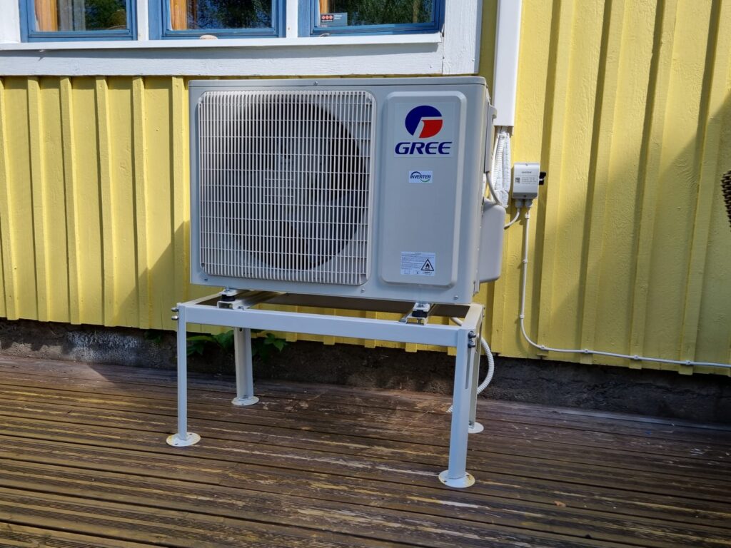 - Ilmalämpöpumppu asennettuna maatukitelineelle ja värinänvaimennuskumeille